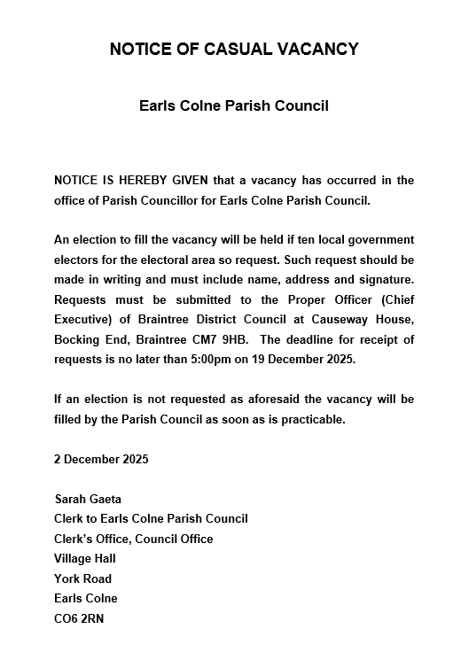 Please see notice below for the casual vacancy declared on 2nd December 2025: